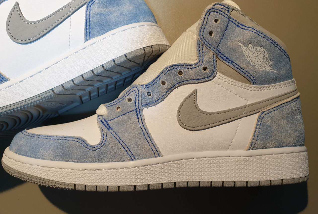 평소에 하이 신발은 잘 신지 않지만 조던 1 레트로 하이 OG 하이퍼 로열은 너무 튀지 않으면서도 은근한 매력이 있네요. 일단은 색상의 조화가 흔하지 않은 느낌이라 독특하고요, 3가지의 메인 색상별 가죽 소재의 차별화를 두어서 유니크함이 느껴지네요. 화이트 부분은 매끄러운 가죽이고 그레이 로고 부분은 스웨이드 가죽 같은데 부드럽고 폭신한 느낌, 블루 부분에는 거친 마감의 스웨이드라 다양한 촉감의 재미도 느낄 수 있는 신발이에요.